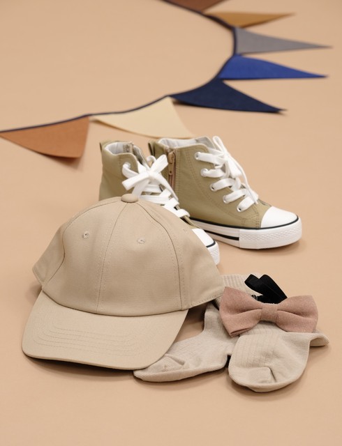 スニーカーやベージュキャップを