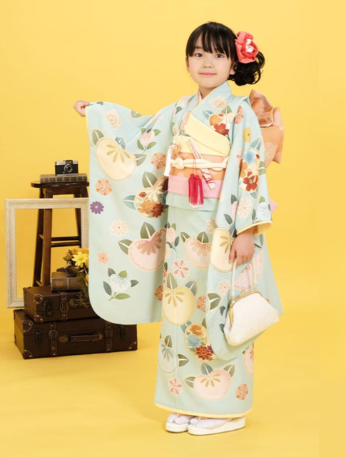 レトロ調の水色に大きな橘の柄がかわいいデザインです