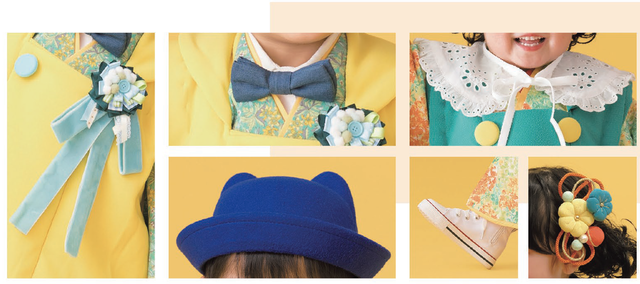 デニムのつけ襟にビビットカラーの髪飾りや小物で