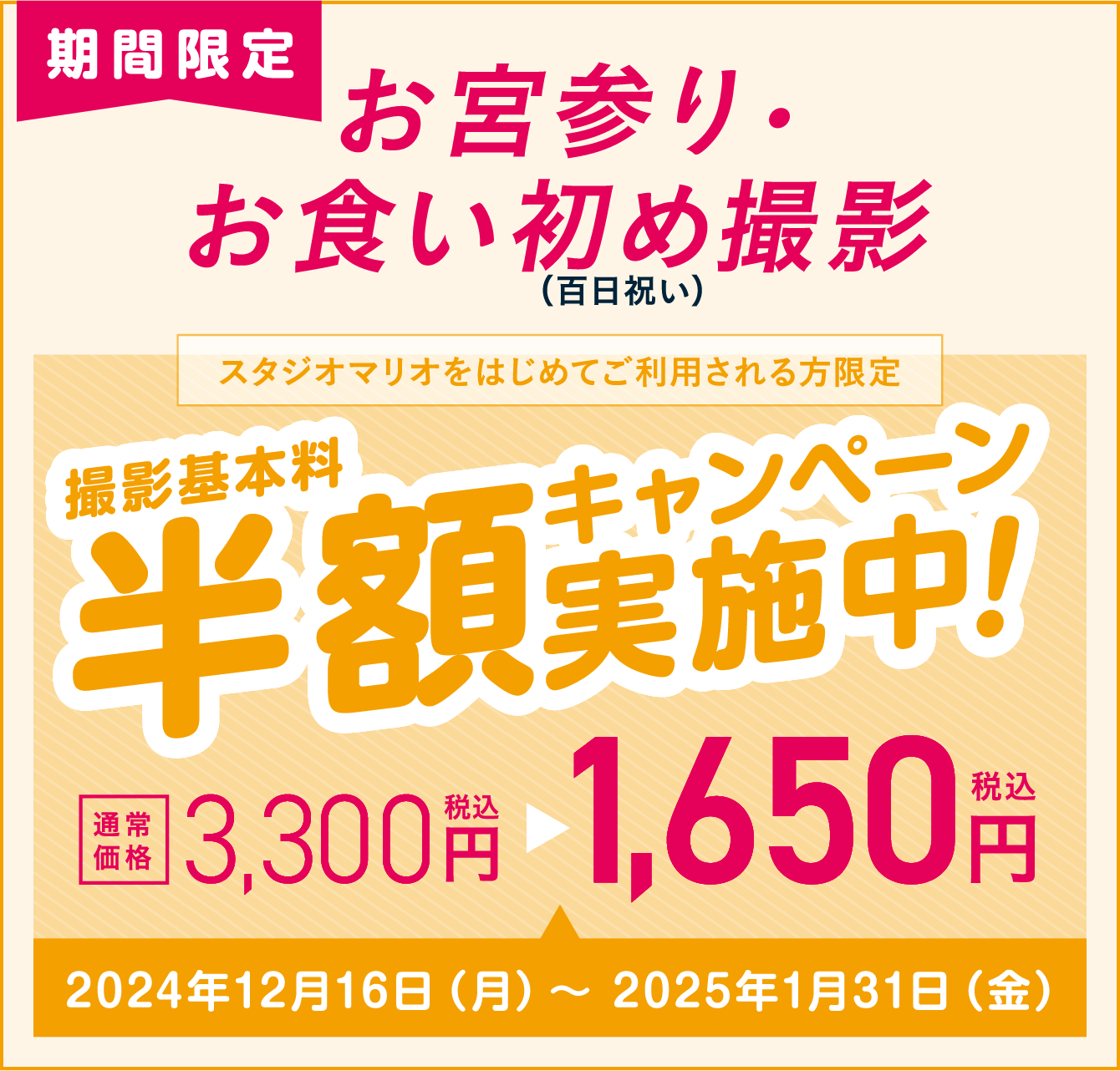 - お宮参り・お食い初め(百日祝い)撮影料半額キャンペーンはスタジオマリオをはじめてご利用の方に限り期間中1回のみ有効です。