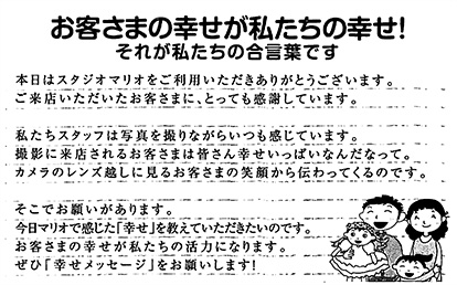 先日、小学校入学の娘の撮影をしました。2年振りの撮影だったので少し不安でしたが、スタッフの方々のおかげで、最後まで笑顔で撮影することが出来ました。