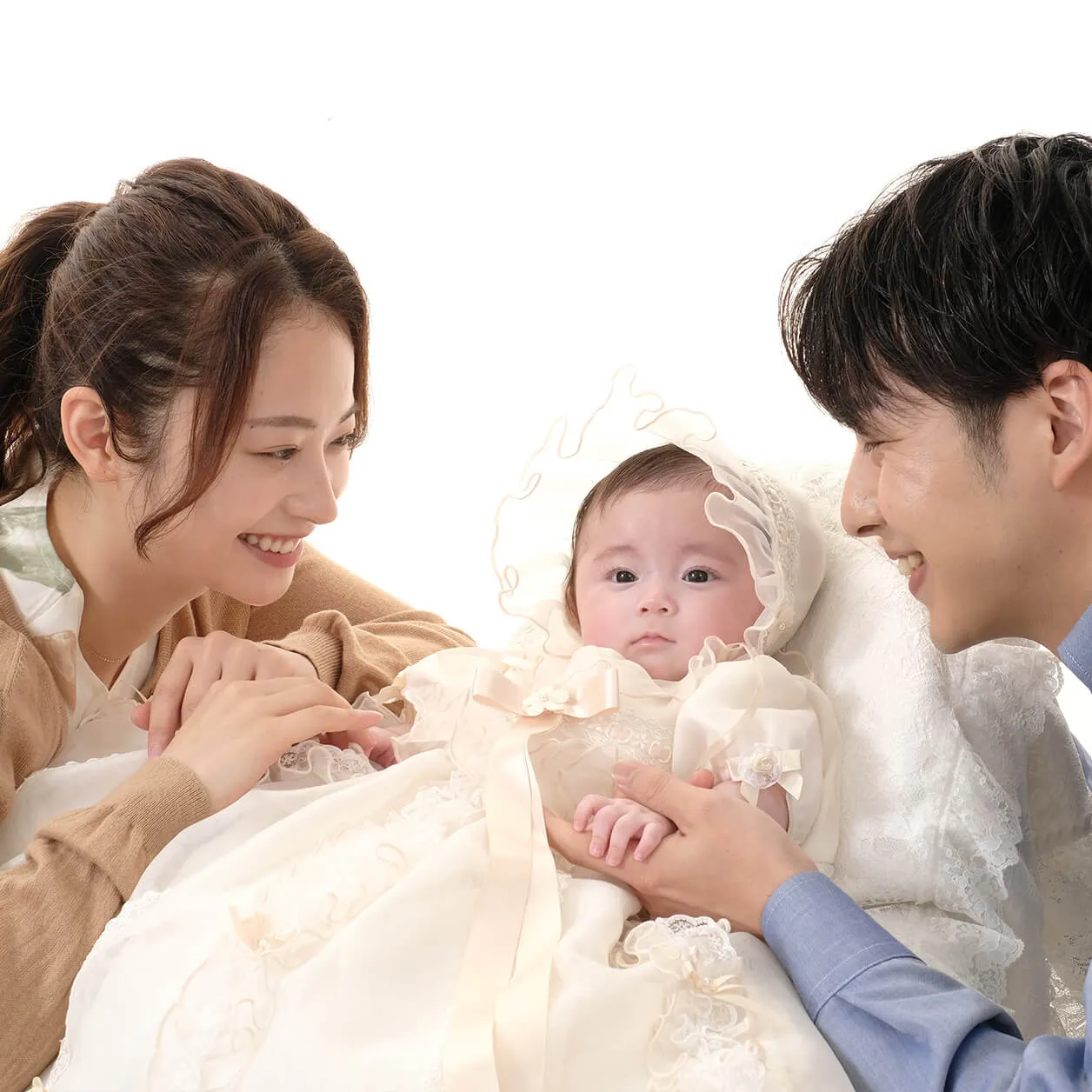 赤ちゃんが無事に生まれたことを氏神様に感謝し、健やかな成長と健康を祈る伝統行事です。生まれて約1ヵ月後に行われることが多く、赤ちゃんにとっては初めての記念日。一生に一度の記念日を、ぜひ家族写真として思い出に残しませんか?